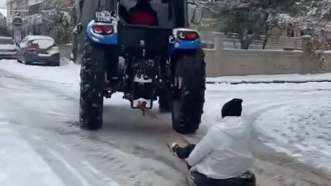 Adıyaman'da etkili olan kar yağışı, renkli görüntülere sahne oldu. Karın tadını çıkarmak isteyen vatandaşlar, traktöre bağladıkları halatla karlı yolda kayarak ilginç anlar yaşadı.