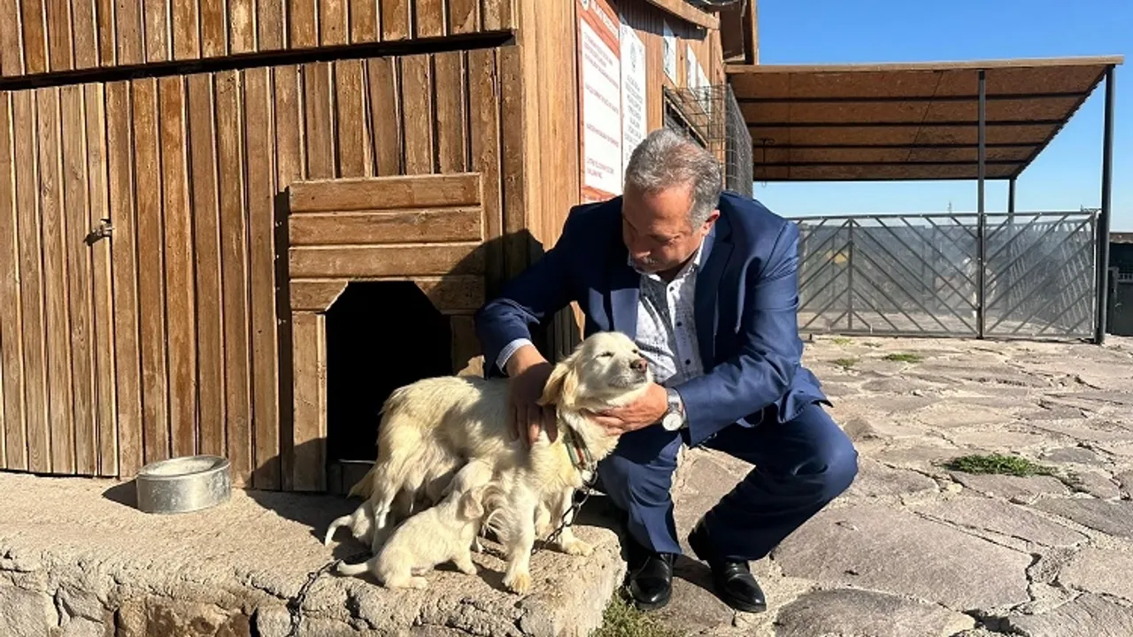 Sevimli pati Nazlı ve altı yavrusunu ziyaret eden Talas Belediye Başkanı Mustafa Yalçın, onları kucağına alarak sevdi.