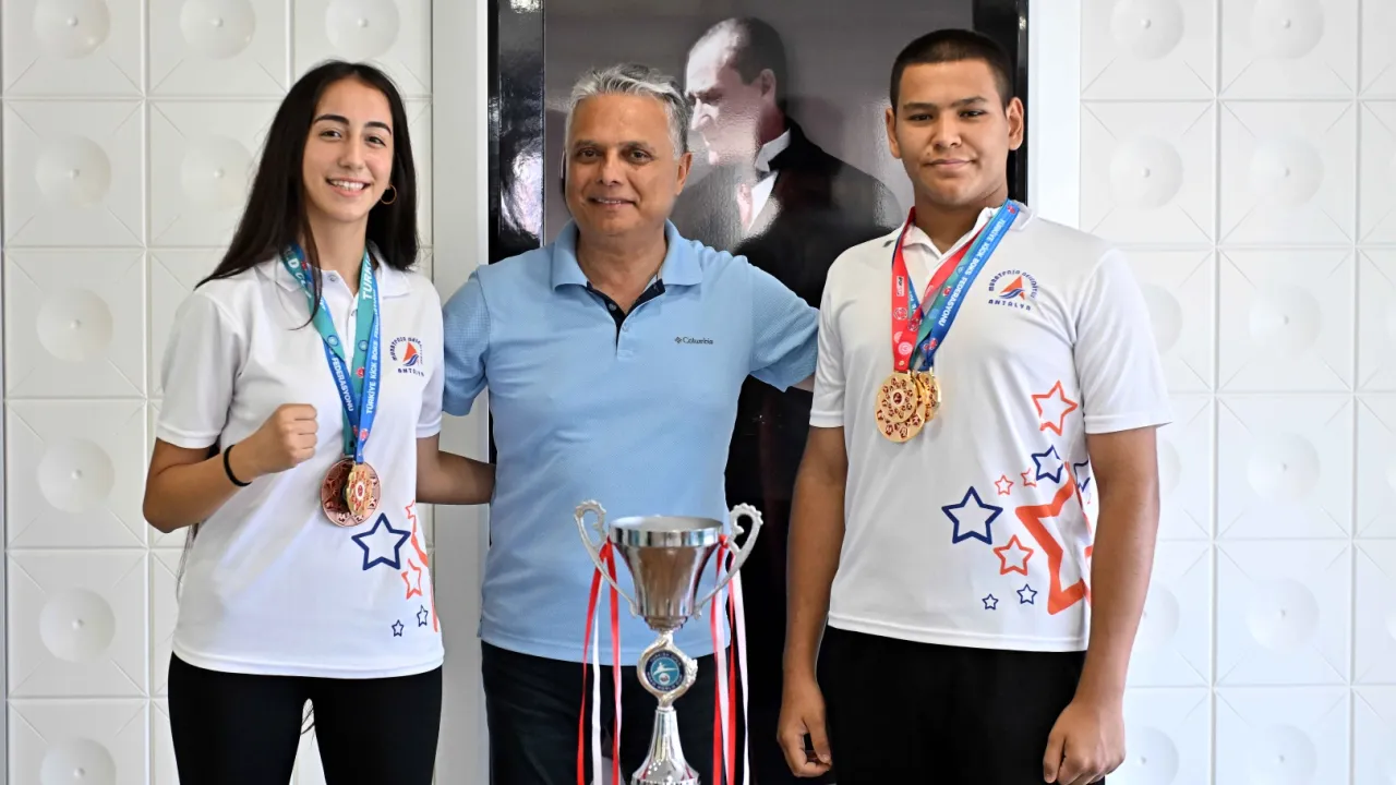 Antalya Muratpaşa Belediyespor’un ‘Kızıl Fırtınası’ lakaplı kick boks antrenörü Hasan Mert Kızıl’ın öğrencileri Lara Naz Senekci ve Mehmet Ündar, Türkiye Kick Boks Şampiyonası’ndan altın madalyayla döndü.İZMİR (İGFA) - İzmir’de düzenlenen şampiyonadan altın madalyayla dönenSenekci ve Ündar’a, ziyarette antrenörleri Hasan Mert Kızıl ve CHP Muratpaşa İlçe Başkanı Can Okan Kıran da eşlik etti.