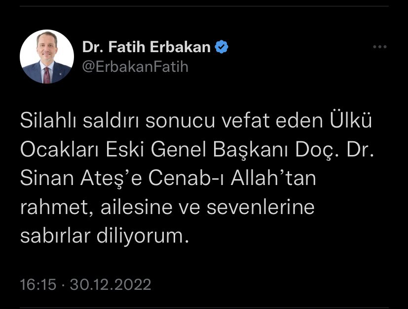 Siyasal iklimin zehirlenmeye çalışıldığı böyle bir dönemde menfur bir silahlı saldırı sonucu hayatını kaybeden Ülkü Ocakları E. Genel Başkanı Doç. Dr. Sinan Ateş’e Allah’tan rahmet diliyorum. Başta ailesi olmak üzere tüm yakınlarına başsağlığı ve sabır diliyorum.