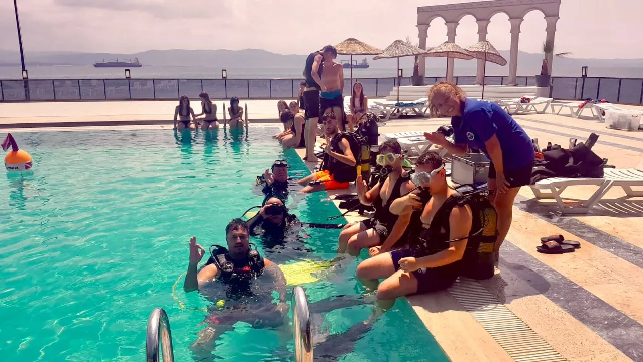 Uzman eğitmenler eşliğinde dalış yapan gençler, Karacaali’nin temiz denizinde ve kamp alanındaki havuzda yüzme becerilerini geliştiriyor.
