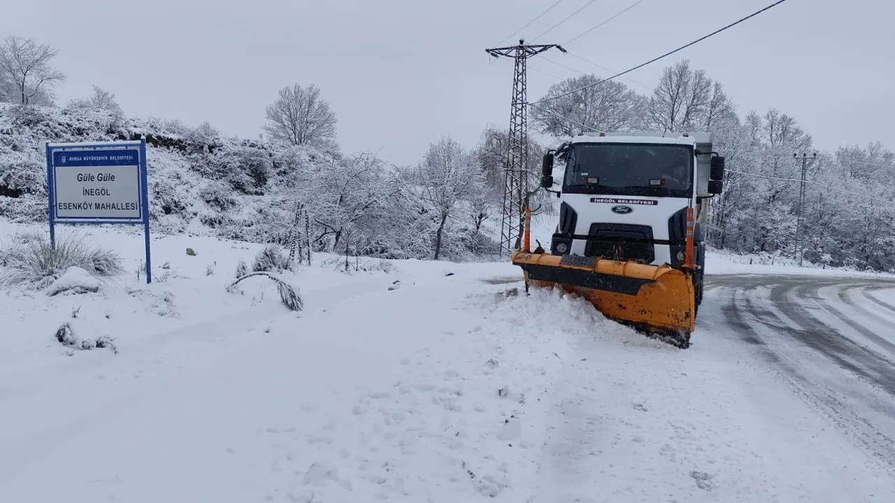 İnegöl Belediyesi, kar yağışının şiddetini arttığı günlerde 126 personel ve 30 araçla sahada. İnegöl'de kapalı köy yolu bulunmazken, ekipler 2 vardiya şeklinde 24 saat çalışmalarını sürdürüyor.
