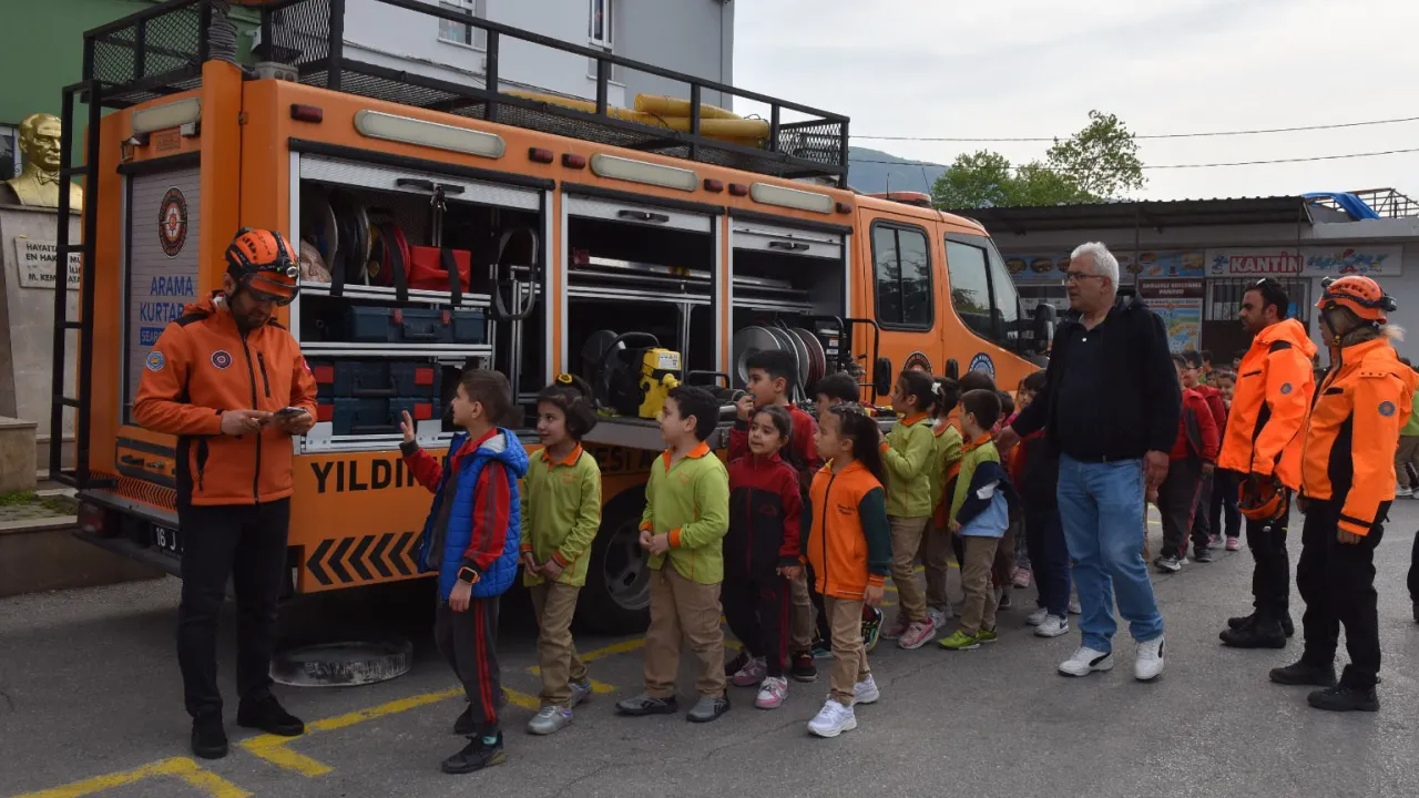 Bursa'da Yıldırım Belediyesi Afet İşleri Müdürlüğü ekipleri, 16 okulda 6 bin öğrenciye ‘afet farkındalık eğitimi’ verdi.BURSA (İGFA) - Yıldırım Belediyesi, afetler ve afetlere hazırlık alanlarında farkındalık oluşturacak çalışmalarına devam ediyor.