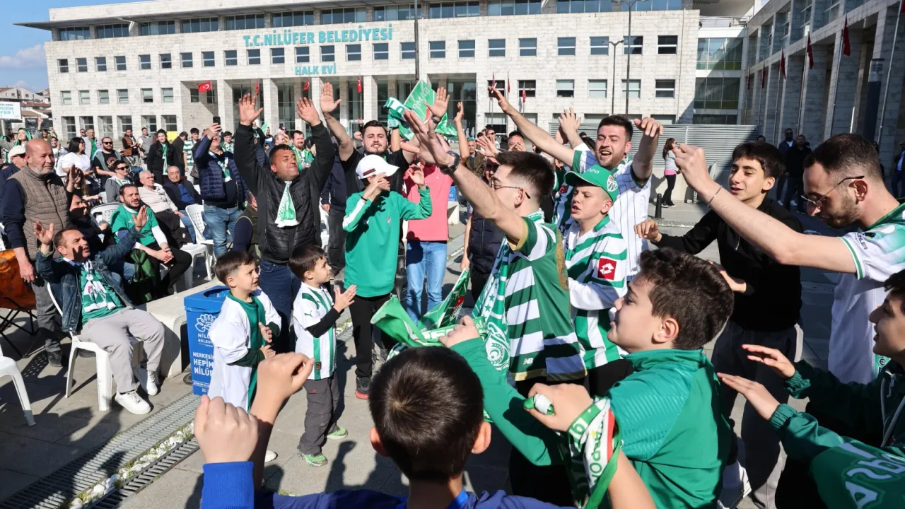 BURSA (İGFA) - TFF Nesine 2. Lig'de şampiyonluk düğümünün çözüldüğü müsabaka, Nilüfer Belediyesi'nin organizasyonuyla Halk Evi önündeki Cumhuriyet Meydanı'na taşındı. 'Omuz Omuza Zafer Yolu' sloganıyla düzenlenen etkinlikte 7'den 70'e yüzlerce yeşil beyazlı takımın sevdalısı tarihi ana tanıklık etti.