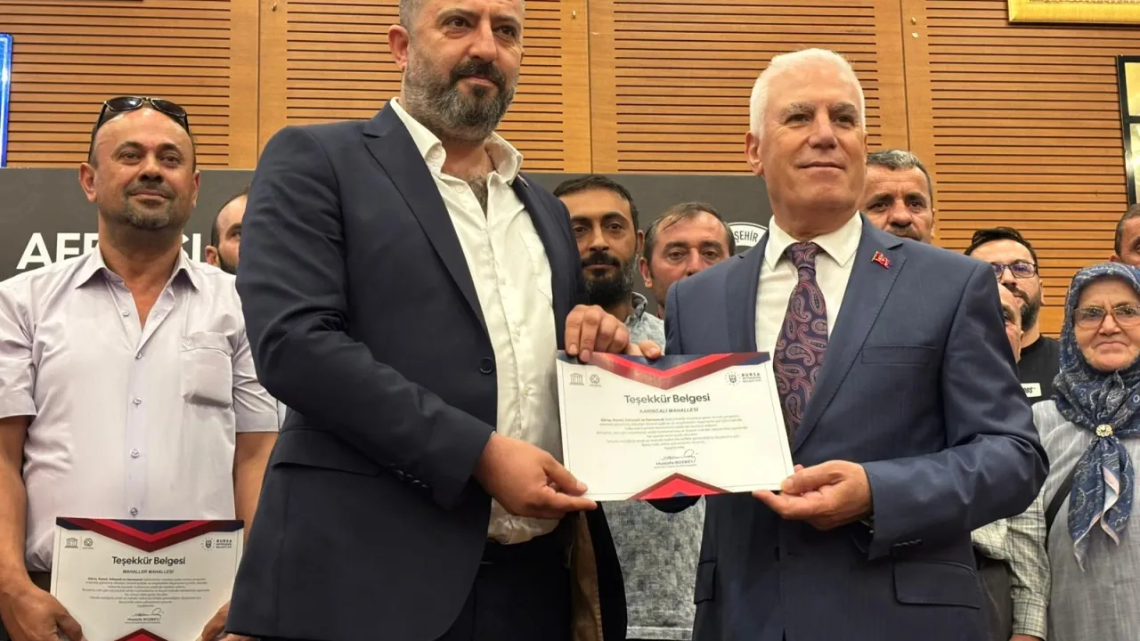 Bursa Büyükşehir Belediye Başkanı Mustafa Bozbey, yangınlarda özveriyle çalışan muhtarlar, ziraat odaları ve belediye çalışanlarına teşekkür belgeleri takdim etti. Anız yakmanın zararlarına dikkat çeken Bozbey, su tasarrufu çağrısı yaptı.Adiviye ELBAŞ - gazeteabc / BURSA (İGFA) - Bursa Büyükşehir Belediyesi, kentin çeşitli bölgelerinde çıkan yangınlarda büyük bir özveriyle görev yapan muhtarlar, ziraat odaları ve belediye çalışanlarını bir araya getirerek teşekkür belgeleri verdi.