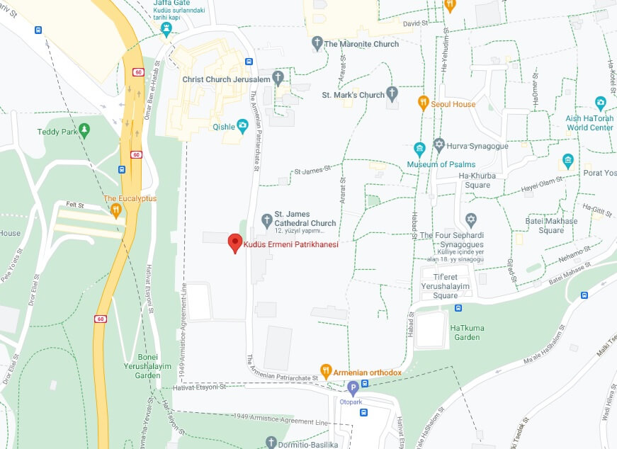 Kudüs Ermeni Patrikliğinin adresi internet sitesinde “Armenian Patriarchate Street 87 Jerusalem Mail: P.O.Box 14235 Jerusalem Old City 9191141 ISRAEL” şeklinde sunulmuş.