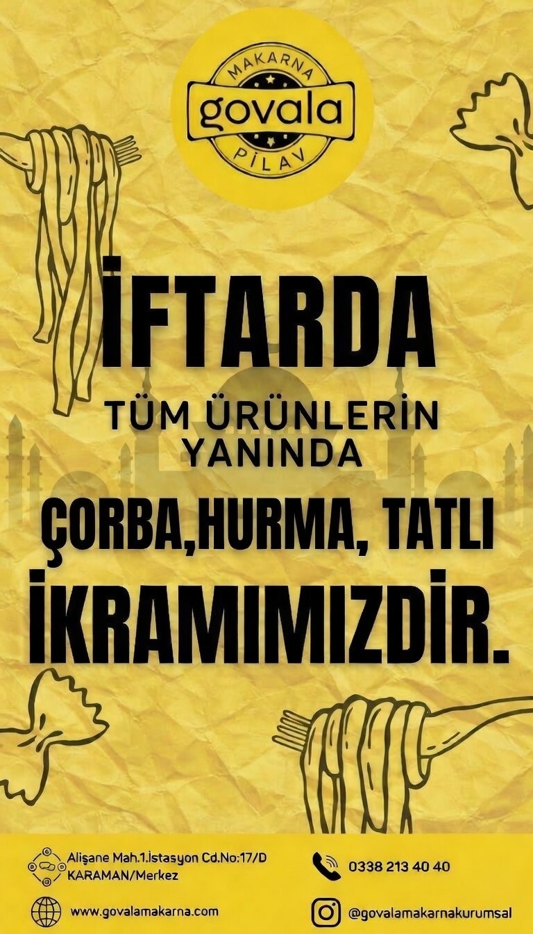 GOVALA Makarnadan yapılan duyuruya göre, iftar saatinde sipariş edilen tüm ana yemeklerin yanında çorba, hurma ve tatlı ikramı işletme tarafından ücretsiz olarak sunulacak. Hem göze hem damağa hitap eden bu cömert ikramlarla, Karaman halkı iftarını keyifli ve doyurucu bir şekilde açma fırsatı bulacak.