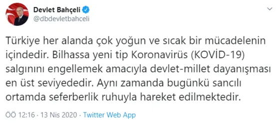 Kararın ardından MHP Genel Başkanı Devlet Bahçeli de bir açıklama yaptı. Bahçeli yazılı açıklamasında, “Bizim temennimiz bu görevine kararlılıkla devamından yanadır” ifadelerini kullandı.