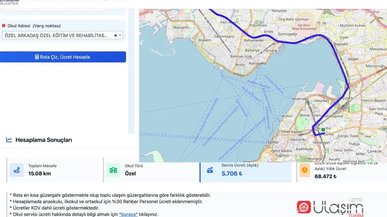 İzmir Büyükşehir Belediyesi, 2025-2026 eğitim öğretim yılı öncesinde velilerin okul servis ücretlerini hesaplayabilmeleri için web sitesi hazırladı. Öğrencinin alınacağı konum, gideceği okul ve mesafeye göre servis ücretinin hesaplanabildiği https://servisucrethesaplama.izmir.bel.tr web adresi, velilere büyük kolaylık sağlayacak.İZMİR (İGFA) - İzmir Büyükşehir Belediyesi, öğrenci velilerine büyük kolaylık sağlayacak yeni bir web sitesini yayına aldı. İzmir Büyükşehir Belediyesi Ulaşım Dairesi Başkanlığı Toplu Ulaşım Hizmetleri Müdürlüğü, 2025-2026 eğitim öğretim yılında servis kullanacak öğrenci velilerinin servis ücretlerini kolayca hesaplaması için https://servisucrethesaplama.izmir.bel.tr web sitesini hizmete sundu. Öğrencinin alınacağı konum ve gideceği okulun hem rotası hem mesafesi hem de ücretinin hesaplandığı web adresi, velilere büyük kolaylık sağlayacak.