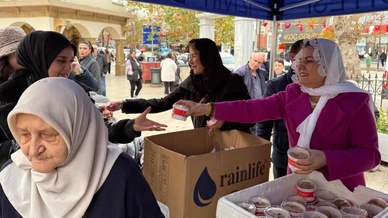 İzmit Belediye Başkanı Fatma Kaplan Hürriyet, Regaip Kandili için Fevziye Camii'nde kurulan stantta vatandaşlara helva ikramında bulundu
