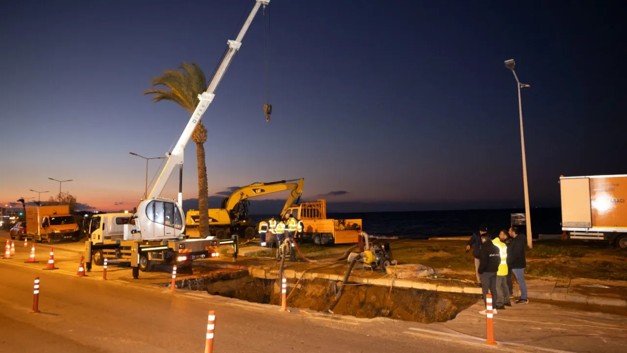 İZMİR (İGFA) - İzmir Büyükşehir Belediyesi İZSU Genel Müdürlüğü, Güzelbahçe ve Narlıdere'ye içme suyu sağlayan Narlıdere Limanreis Mahallesi Mithatpaşa Caddesi ile Hasan Ali Yücel Sokak kavşağında 800 mm çaplı ana iletim hattında meydana gelen arızayı gidermek için gece boyunca seferber oldu.