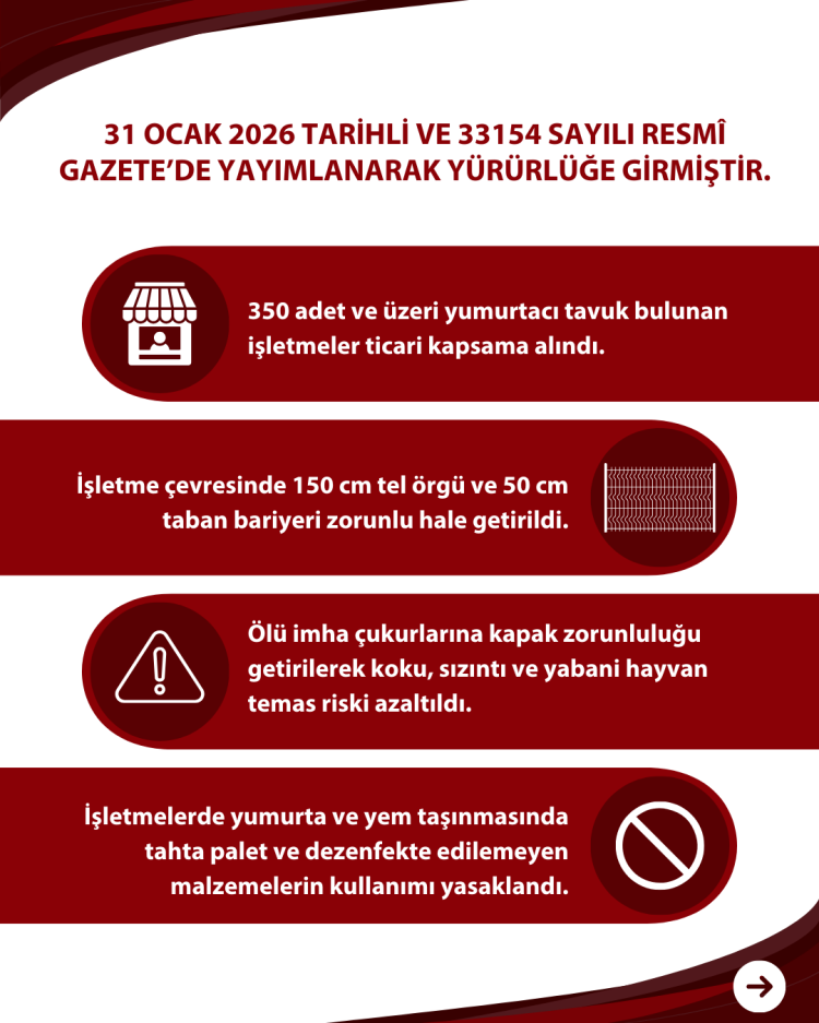 Bakanlık yetkilileri, yeni düzenleme ile sürdürülebilir üretimin sağlanması, salgın hastalık risklerinin azaltılması, üretici kayıplarının önlenmesi ve halk sağlığının korunması amaçlandığını belirtti.