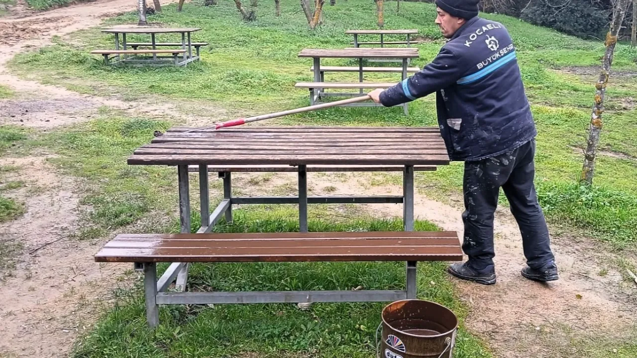 KOCAELİ (İGFA) - Kocaeli Büyükşehir Belediyesi Park ve Bahçeler Dairesi Başkanlığı'na bağlı ekipler, park alanlarında yer alan banklar, oturma grupları ve vatandaşların keyifle vakit geçirip dinlendiği donatı elemanlarını boyayarak vernikliyor.