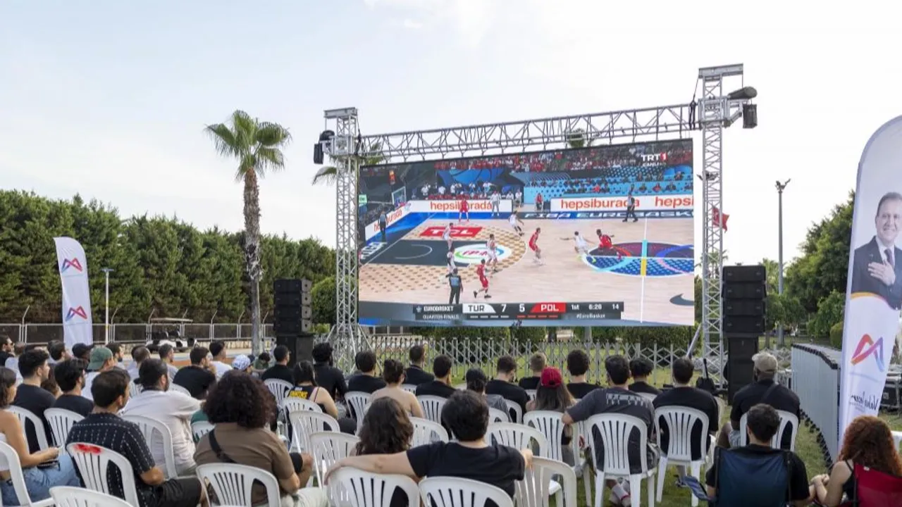 Mersin Büyükşehir Belediyesi, A Milli Erkek Basketbol Takımı’nın EuroBasket 2025 çeyrek final mücadelesini vatandaşlarla birlikte izlemek için Marina önünde dev ekran kurdu.MERSİN (İGFA) - Türkiye’nin Polonya’yı 91-77 mağlup ederek yarı finale yükseldiği karşılaşma, Mersinliler tarafından büyük bir coşkuyla takip edildi.