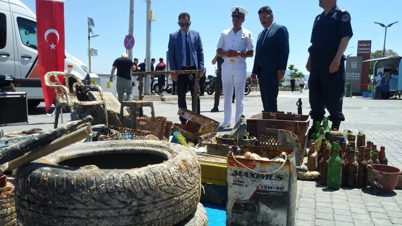 5 Haziran Dünya Çevre Günü dolayısıyla Mudanya’da Sahil Güvenlik Komutanlığı'na bağlı dalgıçlar tarafından yapılan deniz dibi temizliğiyle bin 700 kilogram katı atık toplanarak, toplananlar Mütareke Meydanı’nda sergilendi.BURSA (İGFA) - Sahil Güvenlik Komutanlığı Mudanya'da 5 Haziran Dünya Çevre Günü’nde deniz kirliliğine dikkat çeken anlamlı bir farkındalık çalışmasına imza attı.