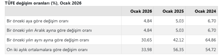 Türkiye İstatistik Kurumu (TÜİK) verilerine göre, Ocak 2026'da Tüketici Fiyat Endeksi (TÜFE) aylık yüzde 4,84 artarken, yıllık artış yüzde 30,65'e geriledi. Gıda, ulaştırma ve konut kalemleri fiyat artışında öne çıktı. Veriler, Ocak ayında enflasyonun aylık bazda yüksek seyrettiğini, ancak yıllık artışın bir miktar gerilediğini ortaya koydu.