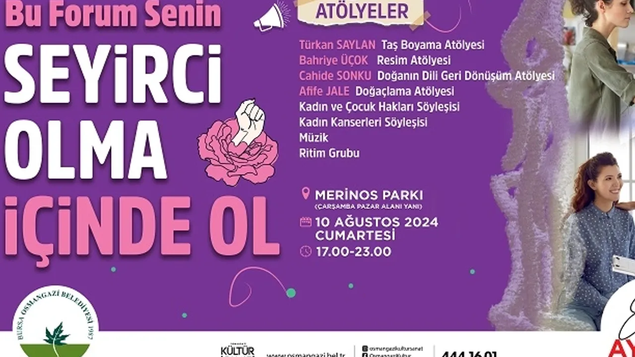 Osmangazi Belediyesi, toplumum her kesimden kadının bir araya gelerek kaynaşmasını ve kadınlar arasında bir arada hareket etme olgusunu pekiştirmek adına Demeter Eşitlikçi Kadınlar Derneği işbirliğinde ‘Bursa Kadın ve Yaşam Forumu’ düzenliyor.BURSA (İGFA) -Kadınlara özel olarak gerçekleştirilecek olan ‘Bursa Kadın ve Yaşam Forumu’ 10 Ağustos Cumartesi günü Merinos Parkı’nda (Çarşamba Pazarpak Yanı) gerçekleştirilecek. Saat 17.00’da başlayacak olan Bursa Kadın ve Yaşam Forumu’nda kadınlar için Taş Boyama Atölyesi, Resim Atölyesi, Doğanın Dili Geri Dönüşüm Atölyesi ve Doğaçlama Atölyesi gibi birbirinden güzel ve renkli etkinlikler yer alacak. Ayrıca gerçekleştirilecek olan interaktif söyleşirler sayesinde katılımcılar, kadınlarda sıklıkla görülen kanser türleri ve kadın hakları konularında bilgilendirilecek. Bursa Kadın ve Yaşam Forumu’na toplumum her kesimden kadınların yanı sıra kadın haklarını savunan erkekler de davetli.
