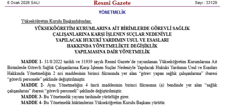 ANKARA (İGFA) - Yükseköğretim Kurulu Başkanlığı tarafından hazırlanan, 'Yükseköğretim Kurumlarına Ait Birimlerde Görevli Sağlık Çalışanlarına Karşı İşlenen Suçlar Nedeniyle Yapılacak Hukuki Yardımın Usul ve Esasları Hakkında Yönetmelikte Değişiklik Yapılmasına Dair Yönetmelik', bugünkü Resmî Gazete'de yayımlanarak yürürlüğe girdi.